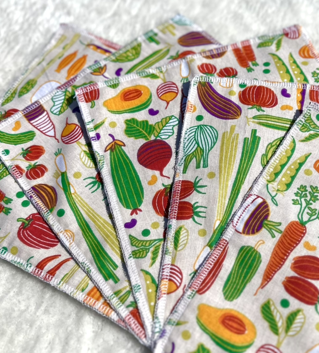 Une face en tissu imprimé et une face en tissu nid d’abeille pour le côté absorbant.