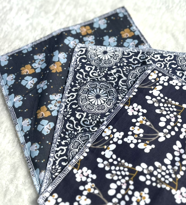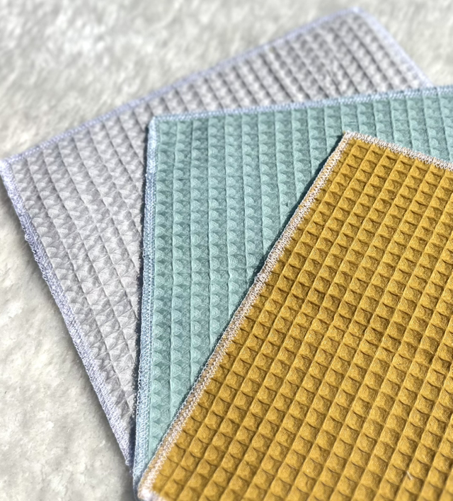 Une face en tissu imprimé et une face en tissu nid d’abeille pour le côté absorbant.