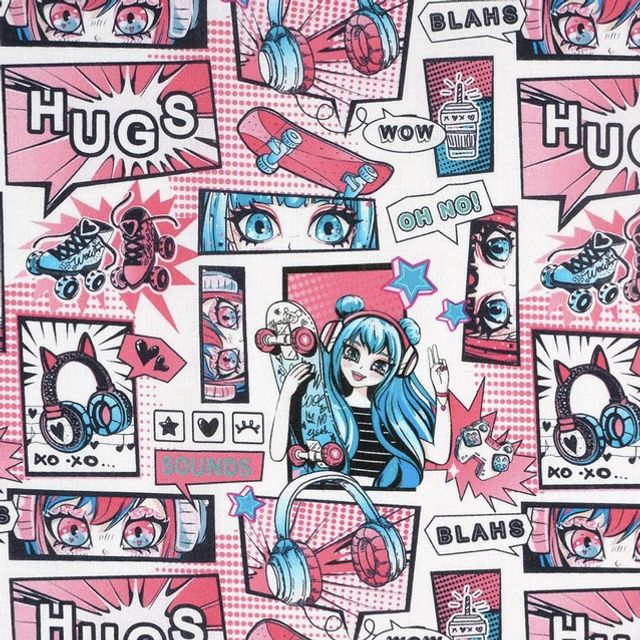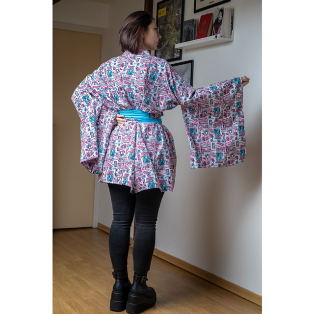 Kimono en popeline de coton blanche motifs roses et bleus.