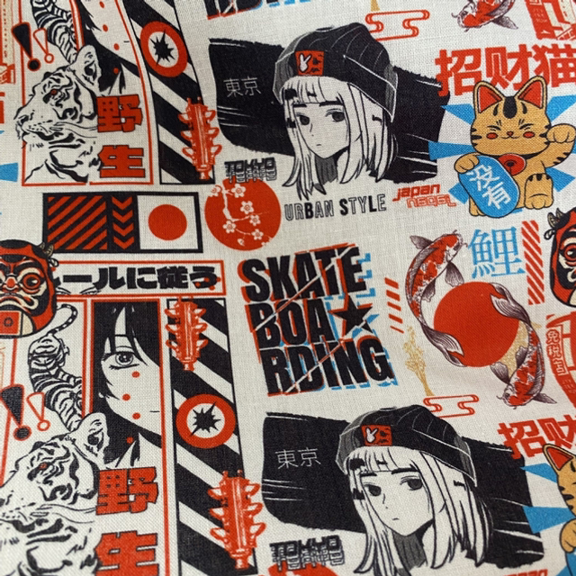Kimono en popeline de coton blanche motifs rouges, noirs, bleus.