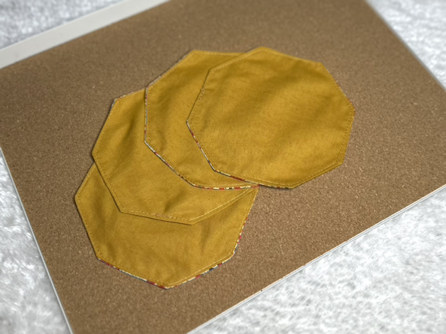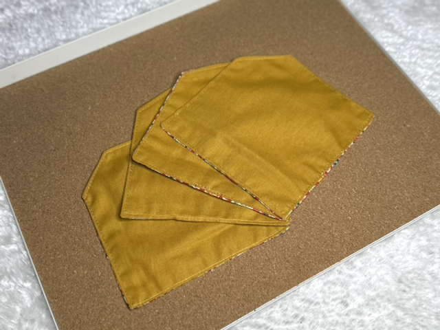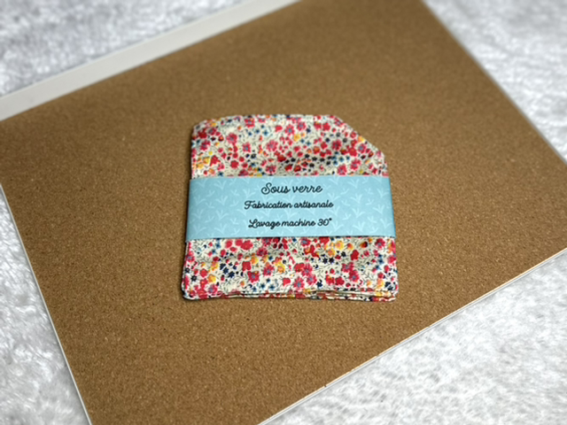 Lot de 4 sous verres, fabriqués à partir de petites chutes de tissus revalorisées pour en faire un accessoire utile au quotidien.